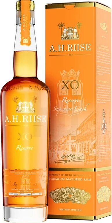 A.H.Riise XO Reserve je výnimočný karibský rum s bohatou históriou a osobitným charakterom, ktorý poteší aj skúsených znalcov. Vyrába sa ručným miešaním starších rumov, niektoré z nich zrejú až do 20 rokov, čo mu dodáva nádhernú zlato-mahagónovú farbu. Tento rum je vyrábaný v limitovaných množstvách ako Single Barrel, pričom každá fľaša má svoje jedinečné číslo, číslo sudu a dátum plnenia, čo zaručuje vysokú kvalitu a exkluzivitu.