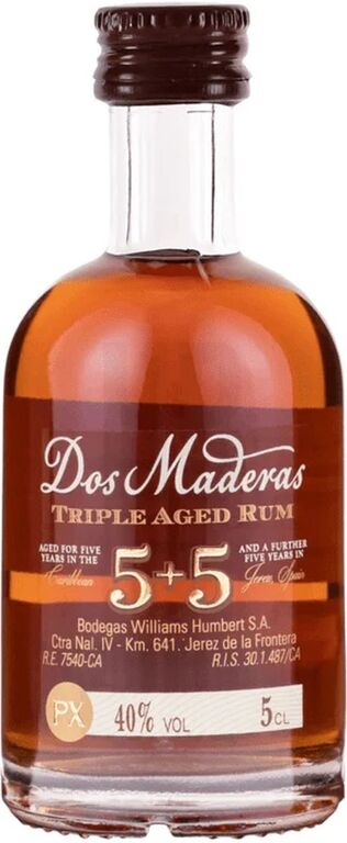 Dos Maderas PX 5+5 pochádza z pivníc Williams & Humbert, kde karibské podnebie spojené so španielskym zrením vytvára rum ako alternatívu k brandy alebo koňaku, perfektný ku kvalitnej cigare. Jeho unikátny proces zrenia v sudoch po sladkom sherry PX mu prepožičiava hladkosť a tóny sušeného ovocia. Tento rum zreje 5 rokov v Barbadosu a Guyane, potom ďalšie 5 rokov v Španielsku v sudoch po sherry Pedro Ximénez, čo mu dodáva jedinečnú komplexnosť a sladkosť.