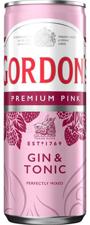 GIN GORDONS PINK & TONIC RTD je pripravený miešaný nápoj v plechovke, ktorý predstavuje jeden z najlepších koktailov s ružovým ginom (pink gin) v kategórii ready-to-drink (RTD). Má jasnú, karnevalovú farbu a vôňu sladkých malín s cukrárskymi tónmi, pripomínajúcimi malinové lekváre s jemným práškovým nádychom.