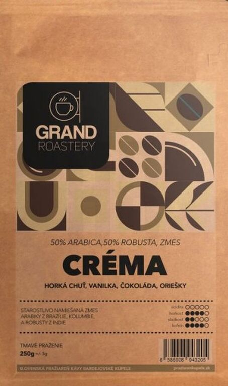 Grand Roastery Créma Blend 1000g je prémiová zmes kávy, ktorá spája čokoládovú intenzitu Južnej Ameriky s jemne korenistými tónmi Ázie. Táto káva je ideálnou voľbou pre milovníkov silného espressa, ktorí ocenia jej bohatú chuť, hustú crému a nulovú aciditu.